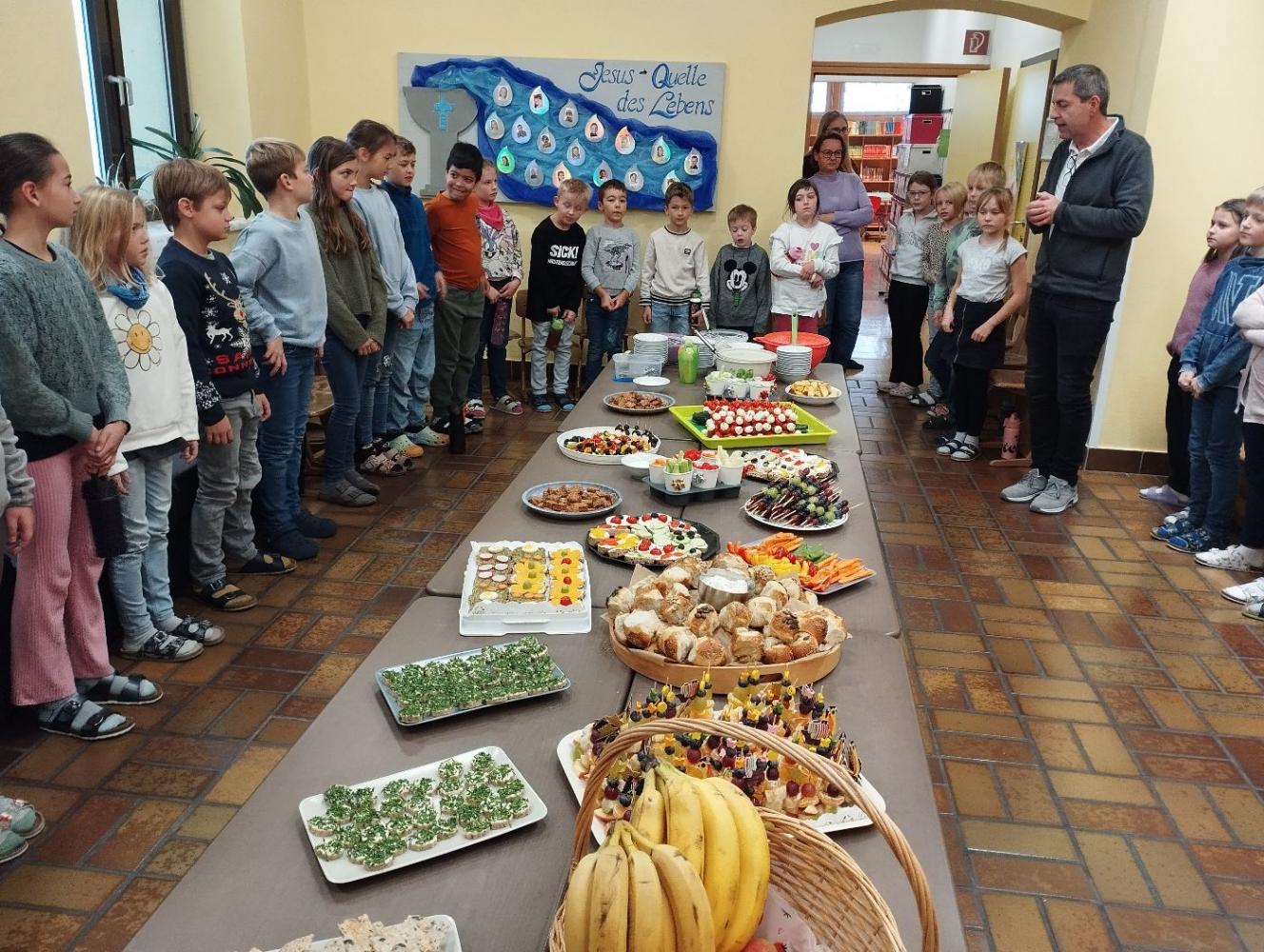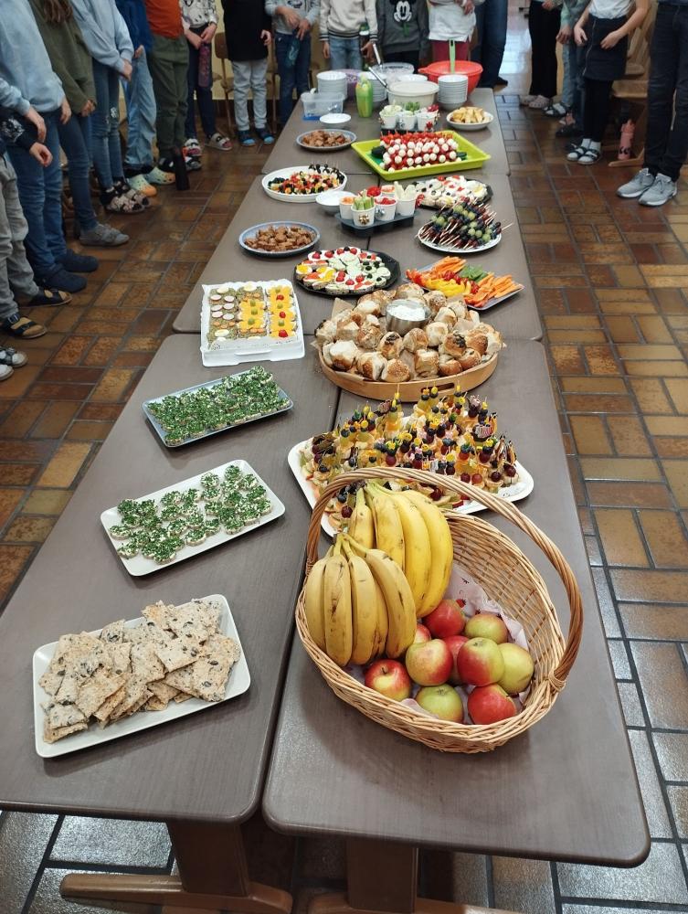 Auch in diesem Schuljahr unterstützen uns die Eltern aller Klassen einmal im Schuljahr mit einer gesunden Jause, welche alle Kinder im Schulhaus gemeinsam genießen dürfen. Dazu treffen wir uns wie gewohnt im geräumigen Schulgang, um gemeinsam die Köstlichkeiten verspeisen zu dürfen, welche die einzelnen Klassen für uns vorbereitet haben. Natürlich wird an diesem Tag die Pause auch verlängert, damit wir diesen besonderen Tag auch wirklich genießen können.