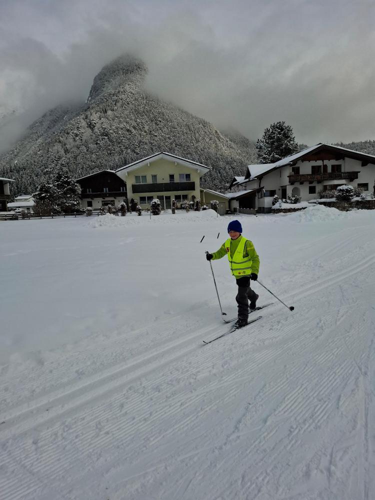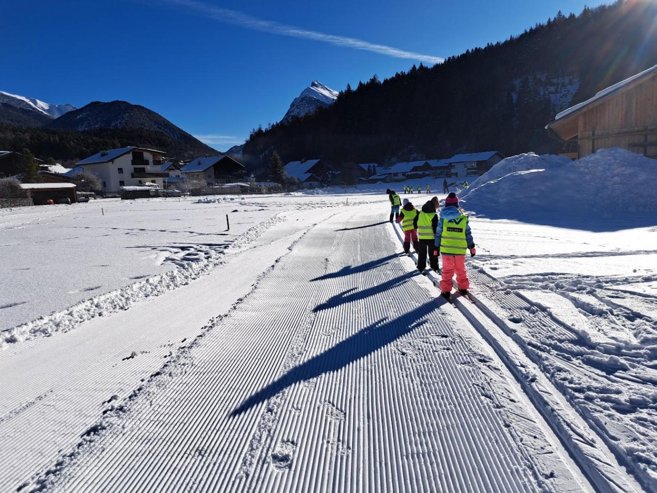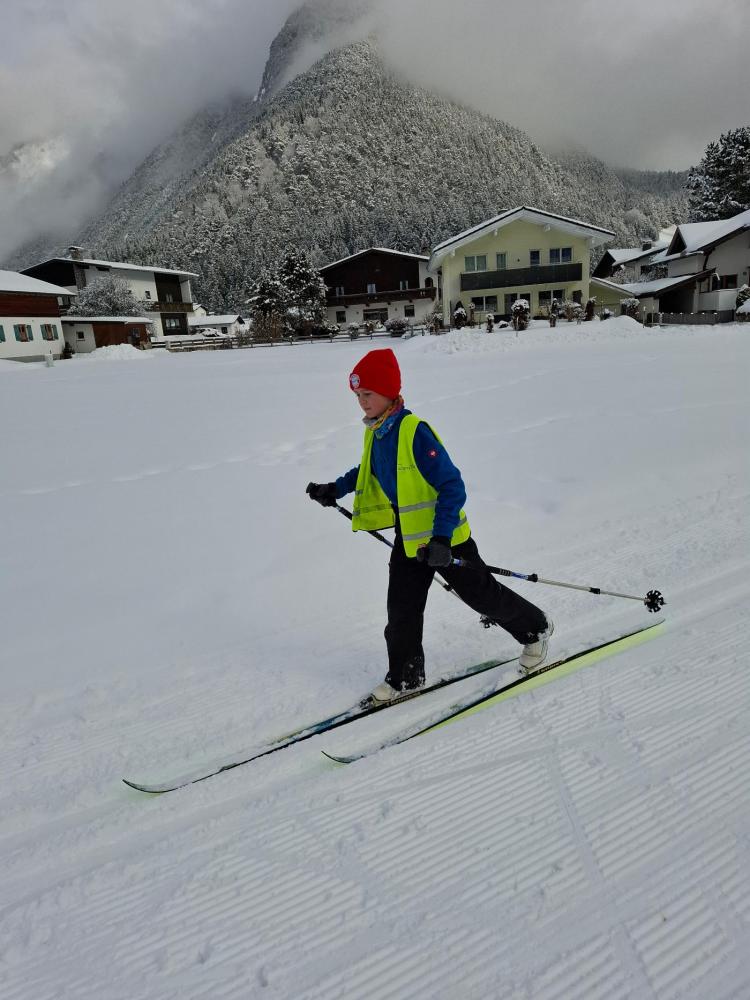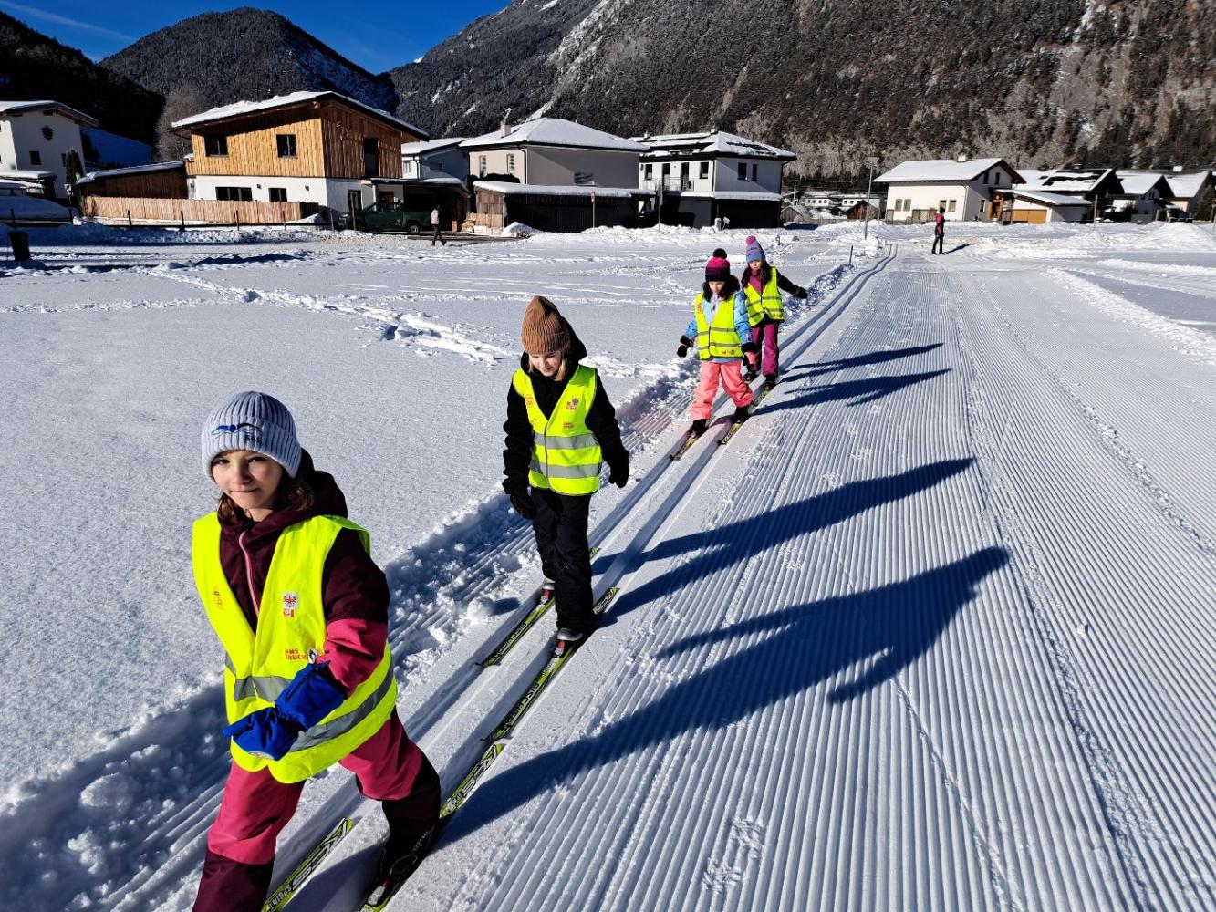 Bei idealer Schneelage durften wir die eigenen sowie die von Armin Lechner ausgeliehenen Langlaufschi auf der ortseigenen Loipe ausprobieren. Jede Klasse bekam dafür in dieser Woche einen eigenen Termin, an dem sie eine Stunde langlaufen konnte. Und da wurde gleich klar, dass sich bei unseren Kindern einige Profis befinden. Denn diese waren teilweise nicht nur professionell ausgestattet, sondern auch sehr erfahren auf den Brettern. Und auch einige unserer Lehrkräfte machten dabei eine ordentliche Figur, welche die Trainingseinheit gleich selbst anleiteten.