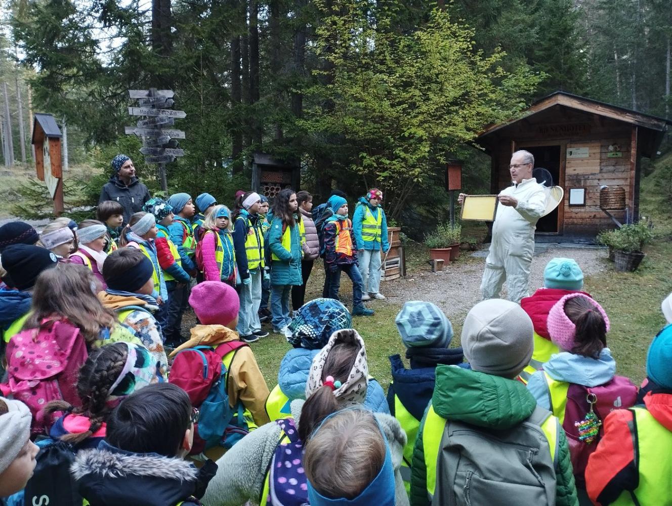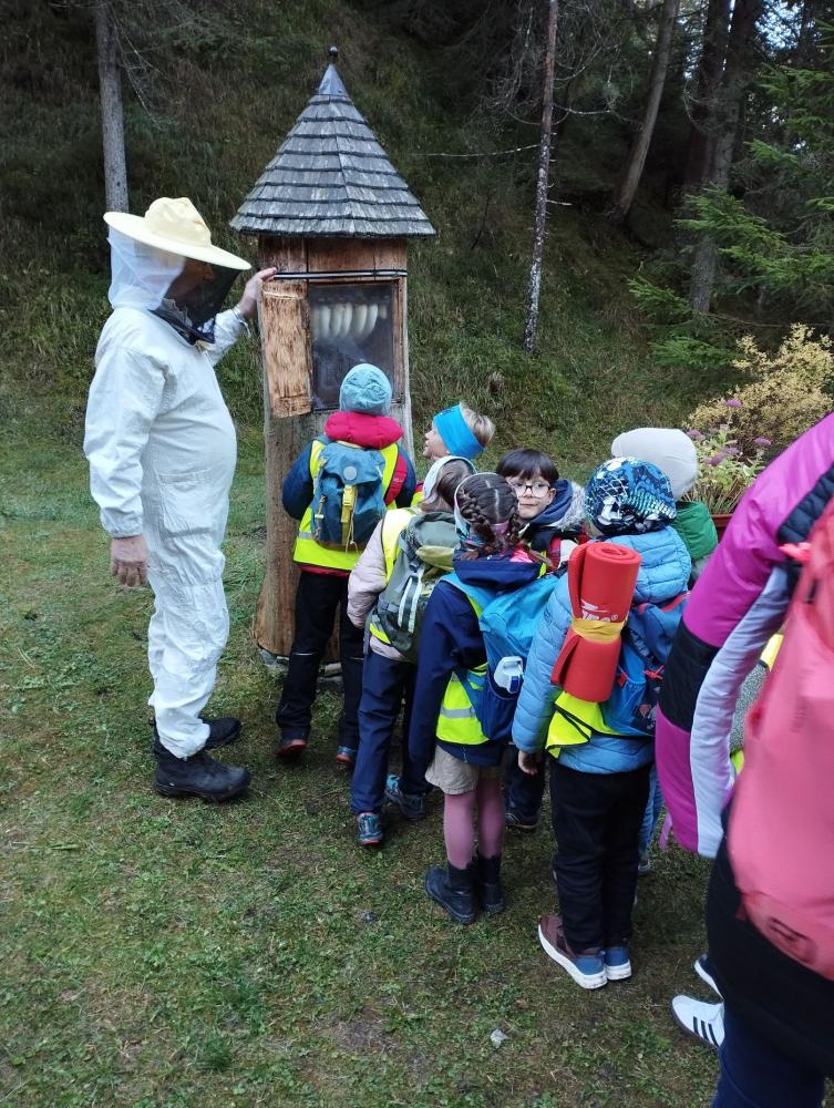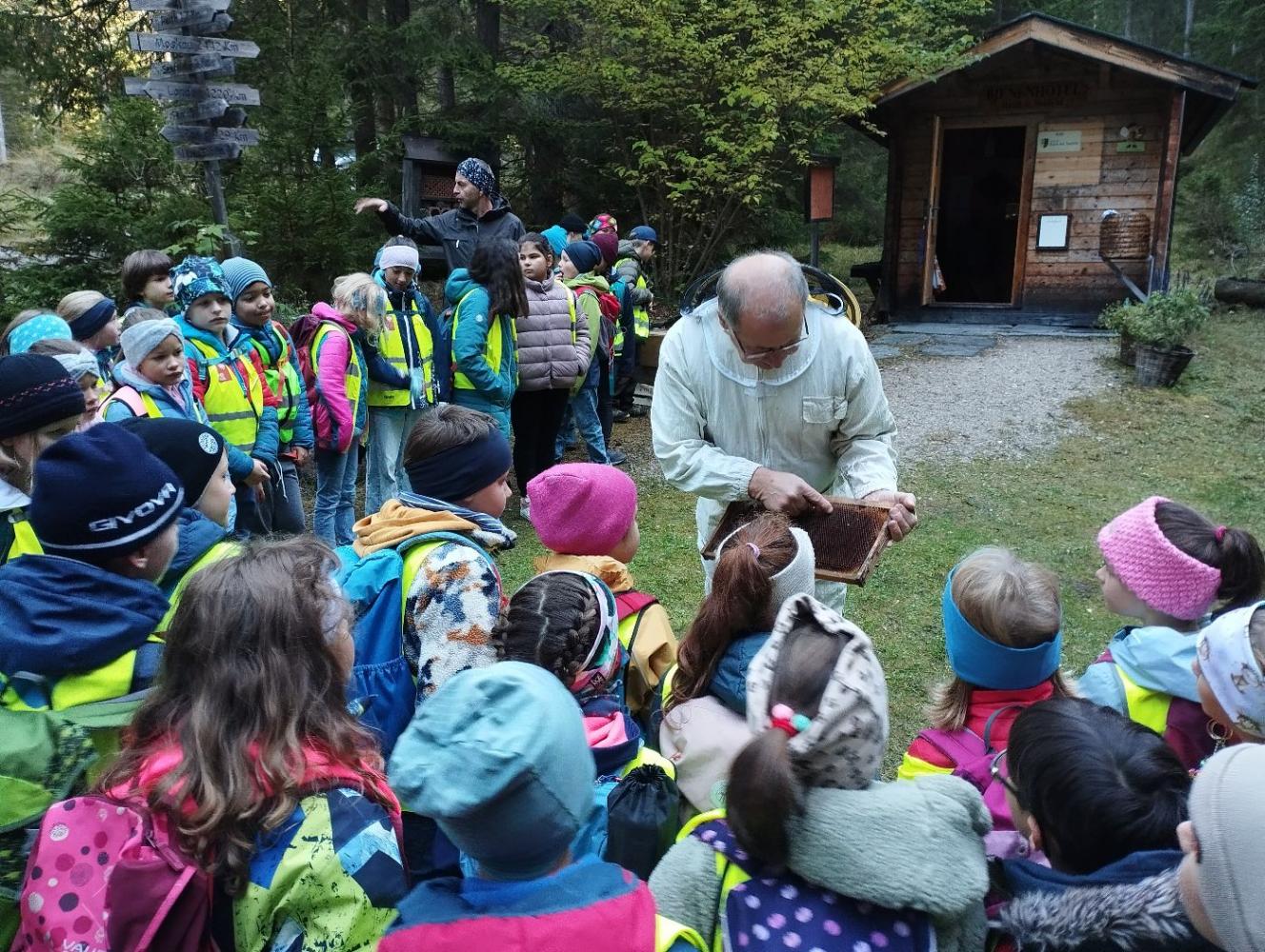 Geführt von Herrn Ude und seinem Lehrer:innenteam bewegten wir uns dabei nicht nur in der frischen Natur, sondern lernten dank der tollen Aufbereitung über die eindrucksvoll gestalteten Infoschilder auch noch so einiges dazu. Doch ein besonderer Höhepunkt erwartete die Kinder beim "Bienenhotel": Der Obmann des Imkervereins der Region Seefeld, Johann Ömer, begrüßte uns in voller Montur, um uns seine Arbeit als Imker hautnah erleben zu lassen. Besondere Highlights waren dabei nicht nur sein Anzug, sondern auch zahlreiche volle, leere und befüllte Waben, verschiedene Aufbewahrungsmöglichkeiten sowie ein Blick in das Bienenhotel, in welchem die Werkzeuge der Imker aufbewahrt werden.