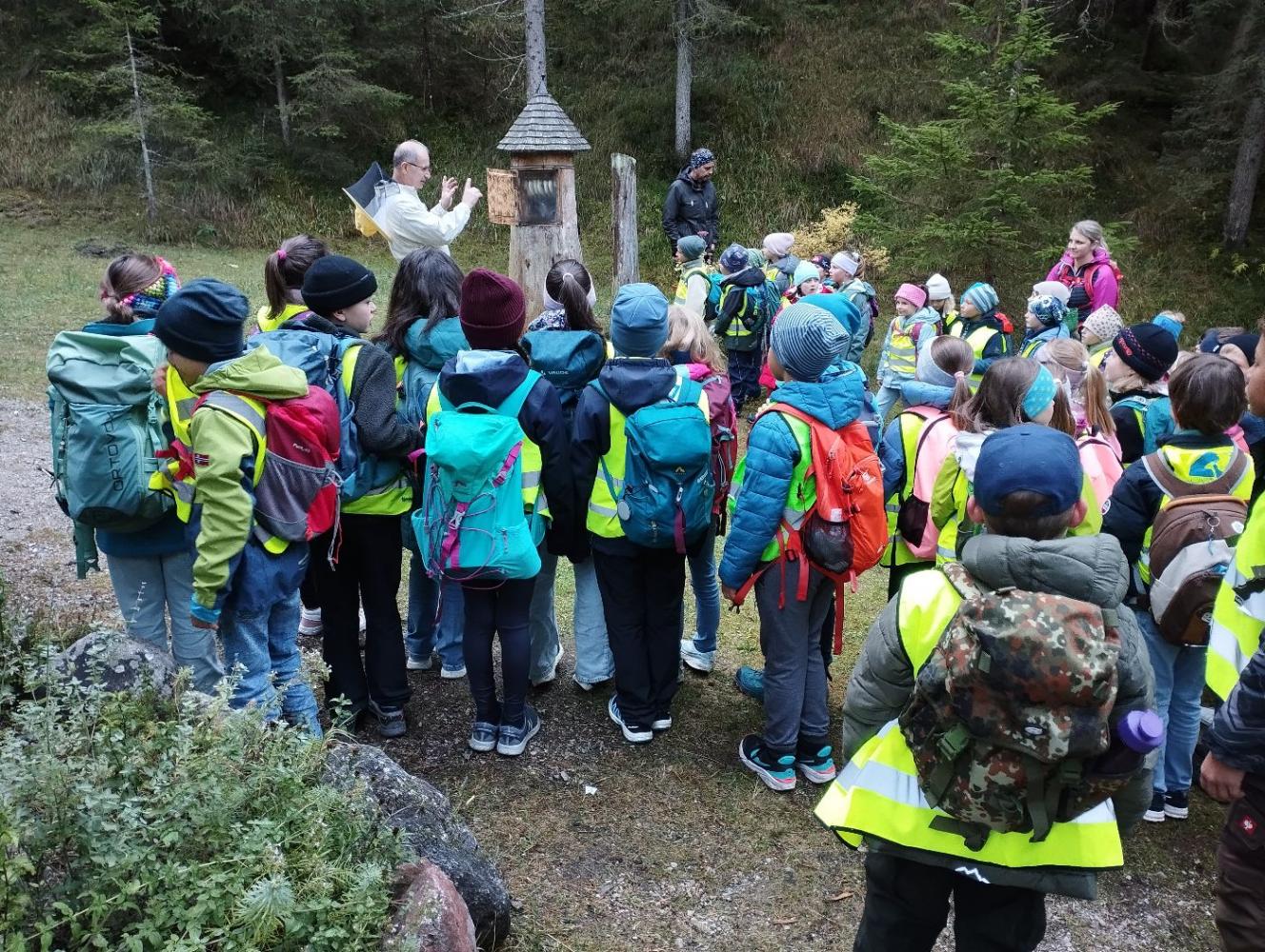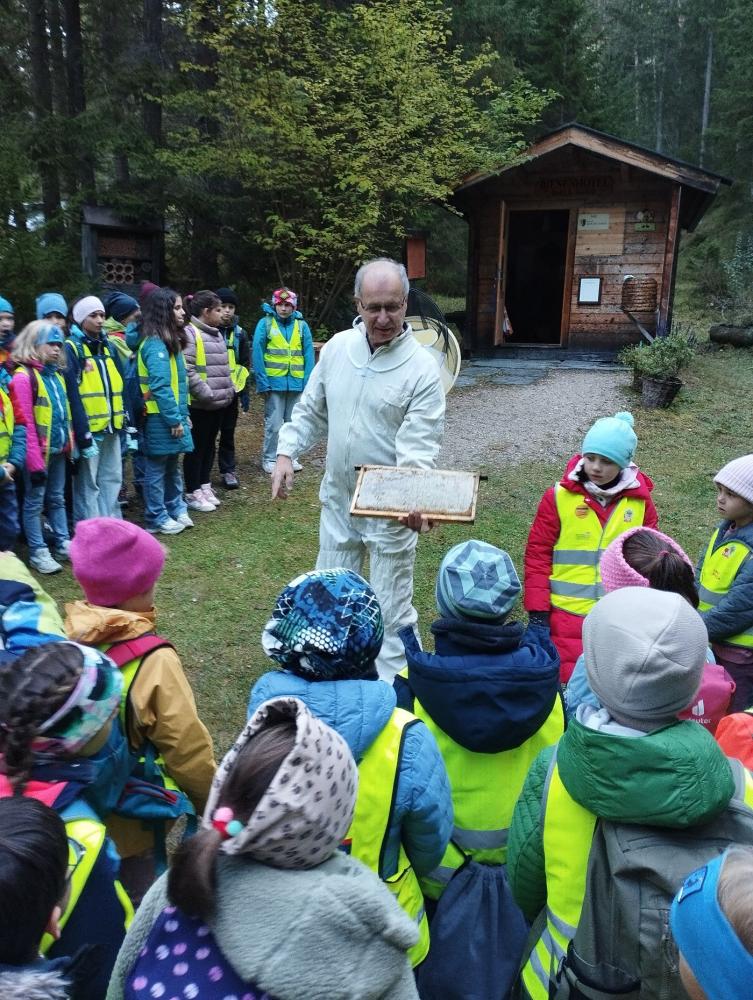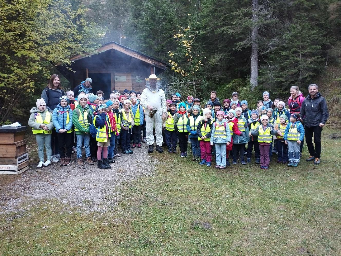 Geführt von Herrn Ude und seinem Lehrer:innenteam bewegten wir uns dabei nicht nur in der frischen Natur, sondern lernten dank der tollen Aufbereitung über die eindrucksvoll gestalteten Infoschilder auch noch so einiges dazu. Doch ein besonderer Höhepunkt erwartete die Kinder beim "Bienenhotel": Der Obmann des Imkervereins der Region Seefeld, Johann Ömer, begrüßte uns in voller Montur, um uns seine Arbeit als Imker hautnah erleben zu lassen. Besondere Highlights waren dabei nicht nur sein Anzug, sondern auch zahlreiche volle, leere und befüllte Waben, verschiedene Aufbewahrungsmöglichkeiten sowie ein Blick in das Bienenhotel, in welchem die Werkzeuge der Imker aufbewahrt werden.